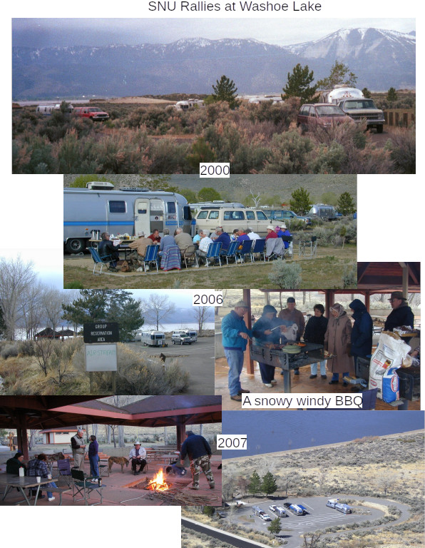 Comment posted on the SNU FaceBook page - From the May 2000 newsletter written by Steve (Stephanie) Burnham – As mentioned above, the next function is a rally at Washoe Lake State Park. The Park is off East Lake Boulevard in Washoe Valley. You may come in either end of East Lake Blvd. One end is jut at the top of the hill from Pleasant Valley going south, about 13 miles from Reno. The other end is just after (or before if you come from Carson City) the 70 mile per hour stretch of the road to the West side of Washoe Lake, 26 miles South of Reno. The entrance to the park is 4.5 miles from that turnoff, or 7 miles from the Washoe Hill entrance. We prefer to come in from the southern entrance road. We think that Loop A is the better loop for group functions. Enclosed is a map of the park, and diagram of the loops. Plan to arrive on Thursday the 4th anytime and dinner will be provided. We will also provide three breakfasts, and one other dinner on Saturday. Friday dinner will be a structured pot luck. That means we would like to have you call and tell us what you would like to prepare for the pot luck. We will need salads, entree type food, vegetables, starches like pasta, potatoes, etc, and dessert. Coffee will be available. There will be a rally fee but we don’t know what it will be until we have a count and figure out what we will provide.